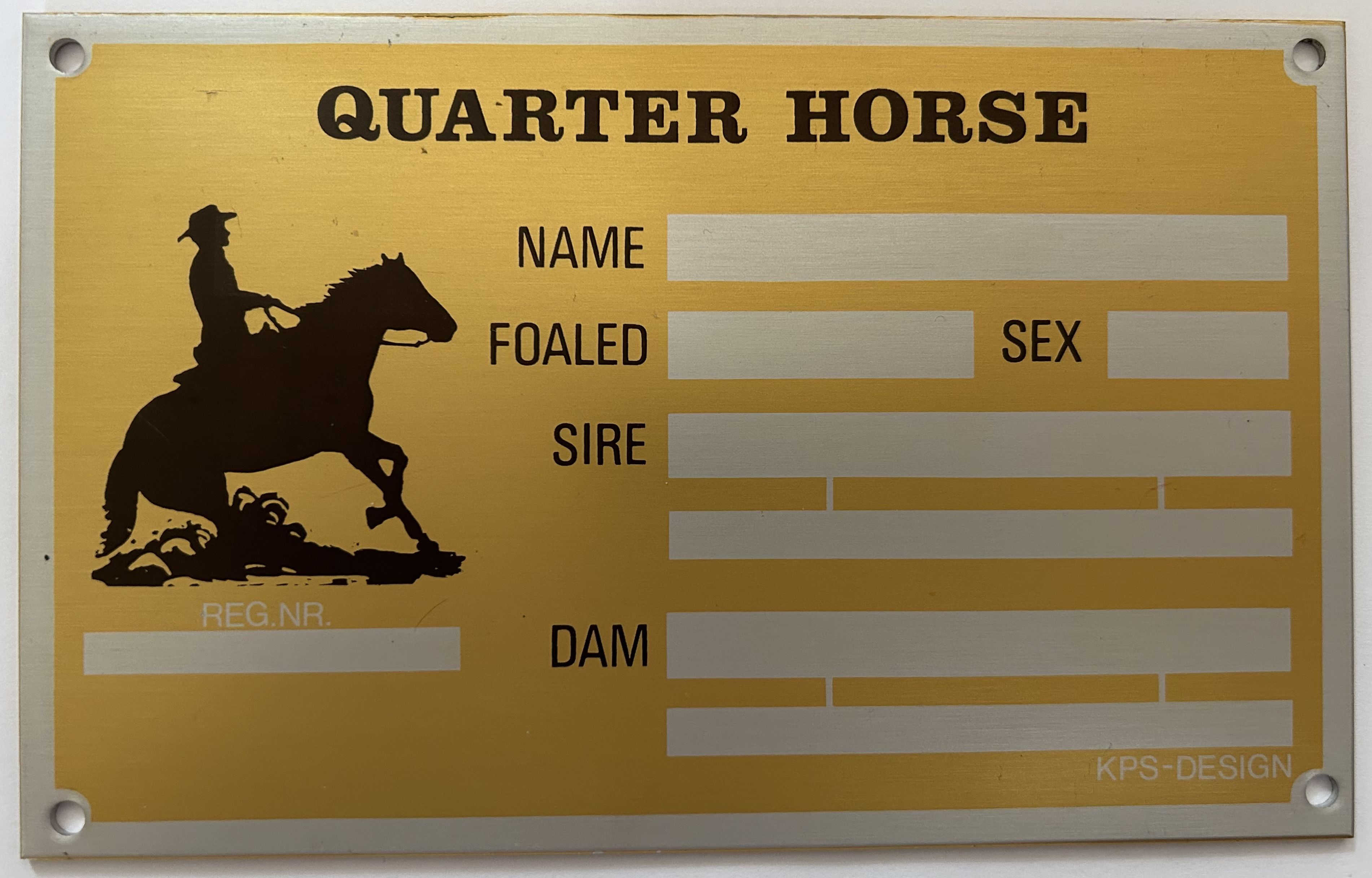 Witterungsbeständiges Boxenschild aus massivem Aluminium mit Quarter Horse Kopf oder Reining Motiv. Robust und langlebig, perfekt für den Stall. Verleiht jeder Box eine elegante Note und zeigt Ihre Liebe zum Paint Horse. Ideal für Pferdeliebhaber und Reitställe.