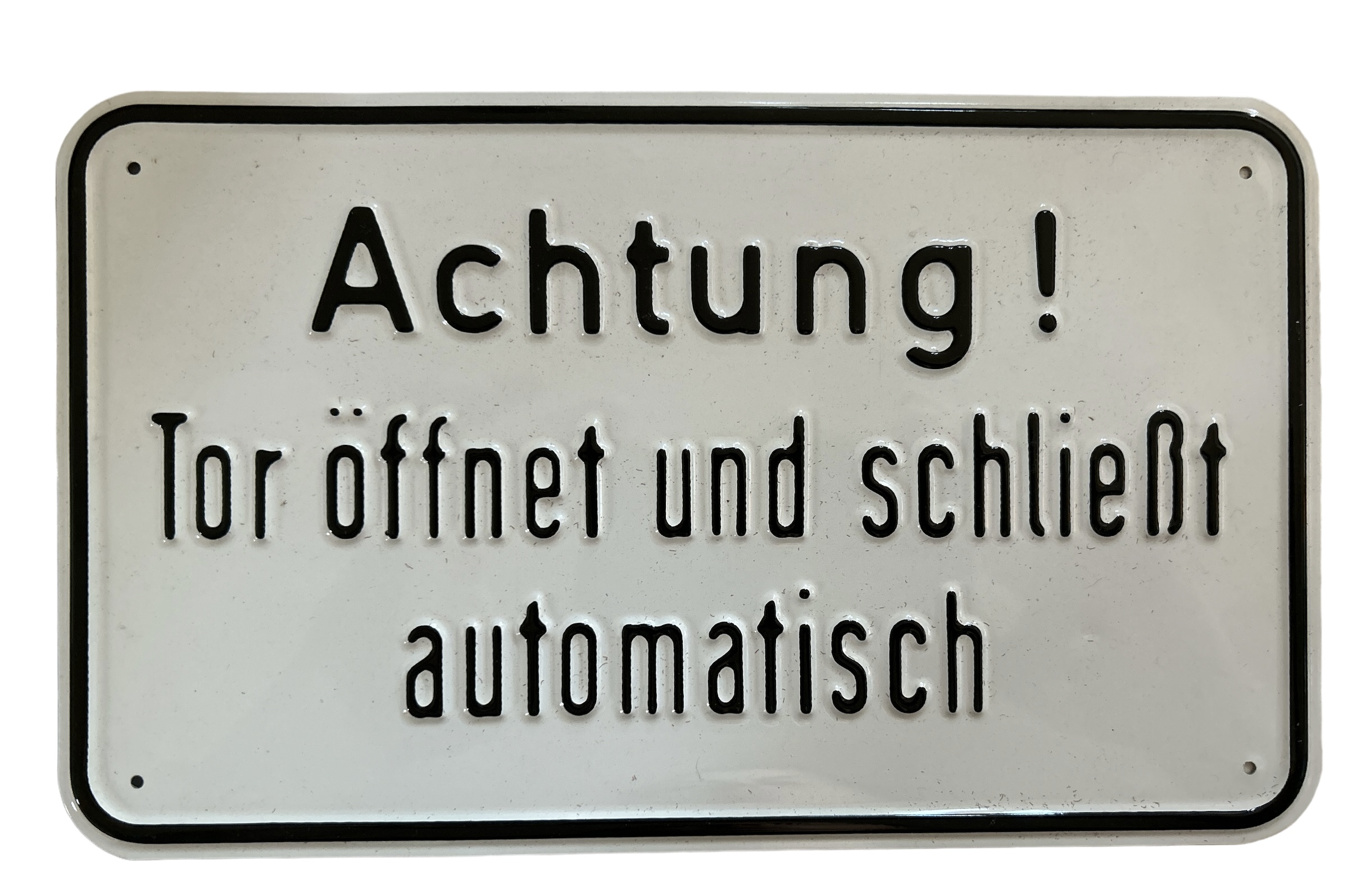 Prägeschild "Achtung" Tor öffnet und schliesst automatisch"